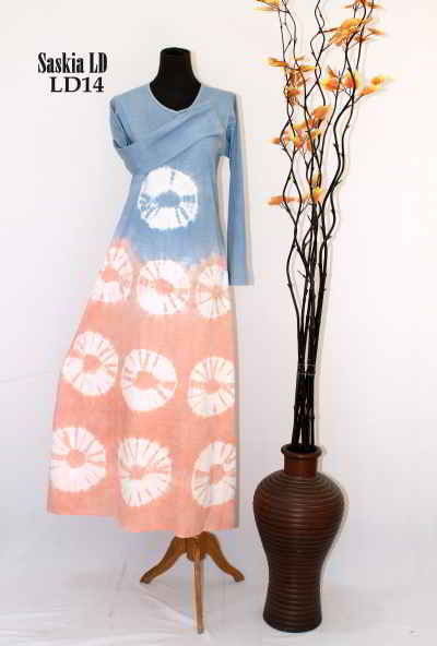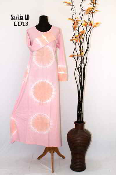 Gamis batik saat ini yang ditampilkan bisa memperlihatkan model gamis batik khas Indonesia. Apalagi di Indonesia setiap daerah hampir semuanya memiliki ciri khas batik masing-masing. Alhasil saat mengenakannya pun menjadi kebanggaan tersendiri. Misalnya mengenakan batik khas Jogja kemudian beberapa hari selanjutnya ganti menggunakan gamis dengan batik khas Pekalongan. Setiap batik memiliki ciri khas masing-masing termasuk batik khas Solo. Salah satunya adalah Gamis Dewasa Saskia LD L. Busana gamis dengan motif jumput ini terbuat dari bahan kardet. Longdress lengan panjang dengan motif jumput terlihat cantik. Tidak sedikit yang kemudian mencari contoh model pakaian ini. Produk ini disediakan dalam dua ukuran yaitu L dan XL. Untuk L memiliki lingkar dada 84 cm, panjang lengan 54 cm dan panjang badan 137 cm sementara ukuran XL memiliki lingkar dada 105, panjang lengan dan badan sama dengan ukuran L.